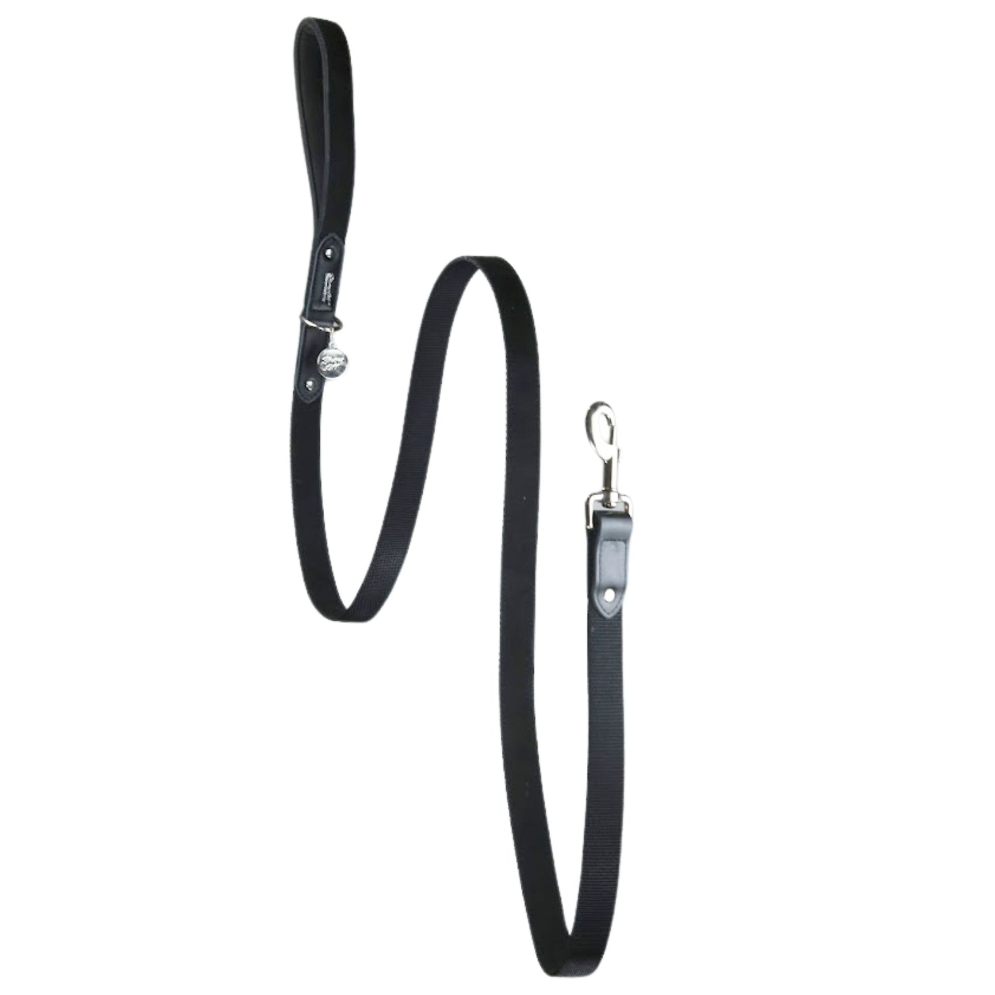 Overlayed with soft suede material and reinforced with durable polyester webbing, this leash delivers classic style without compromising strength. Genuine black leather accents add a refined finish, while silver alloy rivets enhance durability and detail.